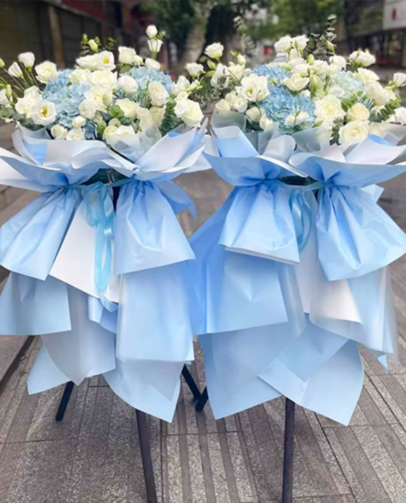 蓝色绣球,白玫瑰,白色洋桔梗, 尤加利,蓝色包装纸,三脚架